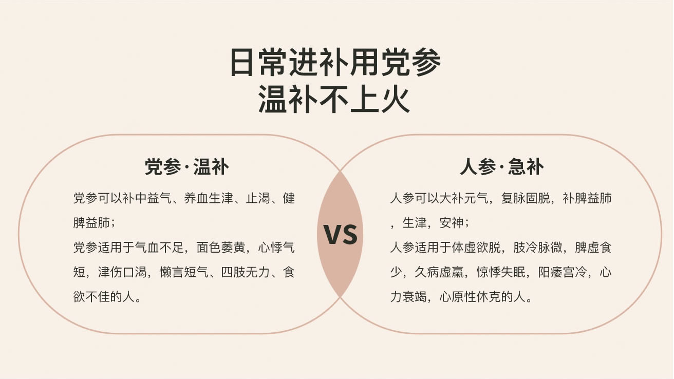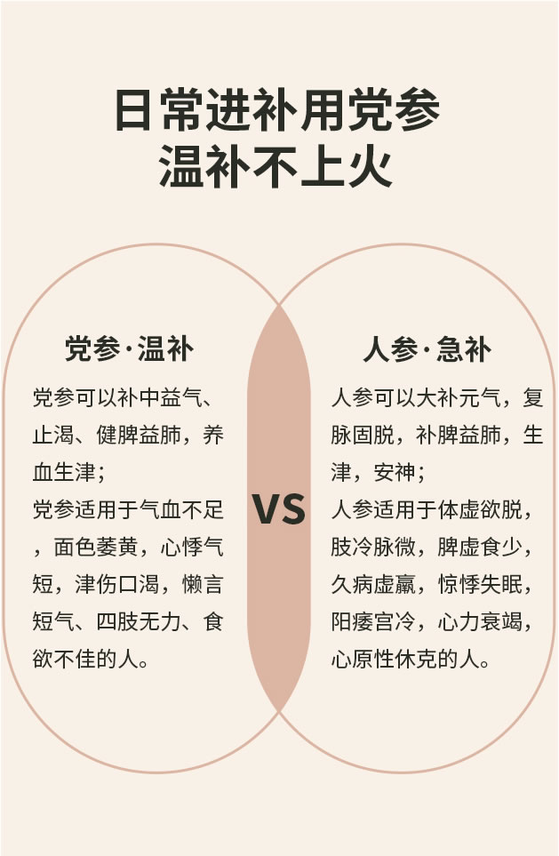 中医认为,党参功效与人参相似,但党参味甘、性平、不易上火,属温补型滋养品,可以久服。《神农本草经》记录:“久服有轻身不老、延年神仙之功”。